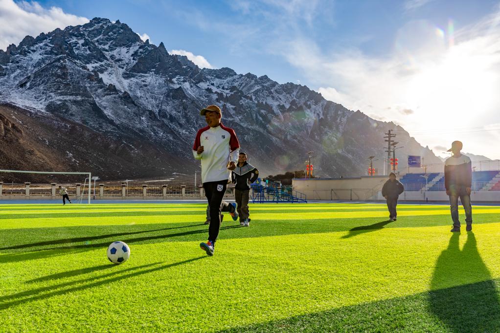 頓珠嘉措是嘉黎縣中學(xué)初二的學(xué)生,也是該校足球隊的成員。嘉黎縣中學(xué)的球場被當(dāng)?shù)厝朔Q為“雪山下的夢幻球場”,球場背靠連綿的雪山,白云飄蕩在藍天。盡管嘉黎縣海拔高、空氣稀薄,但是當(dāng)?shù)睾⒆觽儗w育運動的熱愛不減。