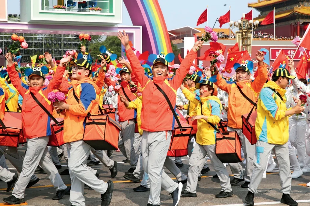 2019年10月1日上午,慶祝中華人民共和國成立70周年大會在北京天安門廣場隆重舉行。這是快遞小哥所在的“美好生活”方陣。