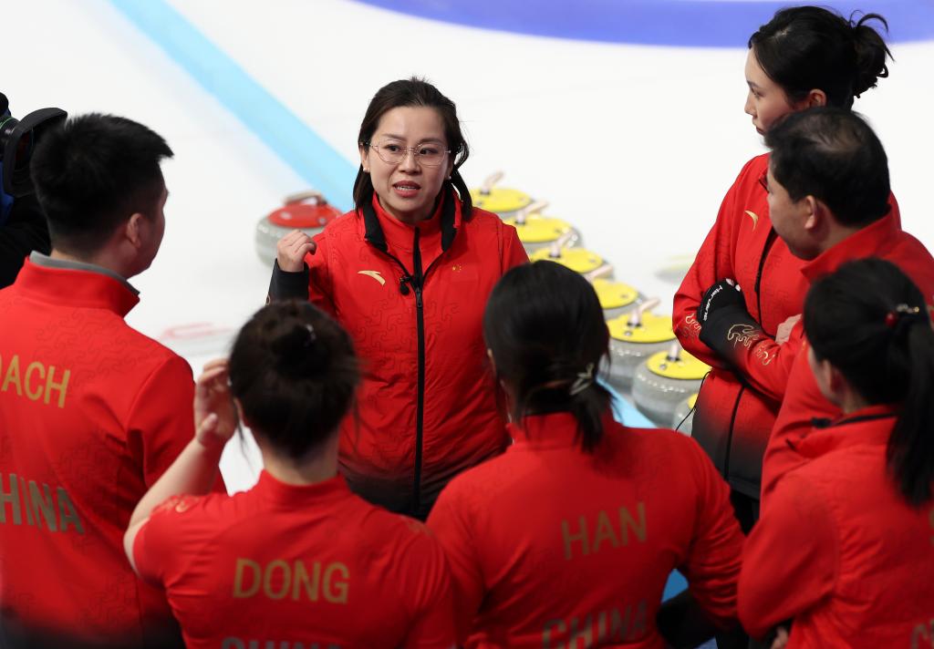 2025年2月13日,中國(guó)隊(duì)選手王芮(中)在比賽間隙和隊(duì)友及教練交流。當(dāng)日,在哈爾濱舉行的第九屆亞冬會(huì)冰壺女子半決賽中,中國(guó)隊(duì)5比2戰(zhàn)勝日本隊(duì),晉級(jí)決賽。新華社記者 胡星宇 攝