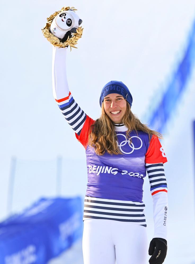 2022年2月9日,獲得亞軍的法國選手克洛艾·特雷斯珀什在頒發(fā)紀念品儀式上。當日,北京2022年冬奧會單板滑雪女子障礙追逐決賽在張家口云頂滑雪公園舉行。新華社記者 胡虎虎 攝