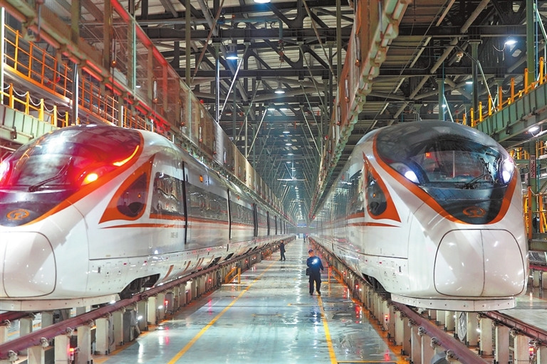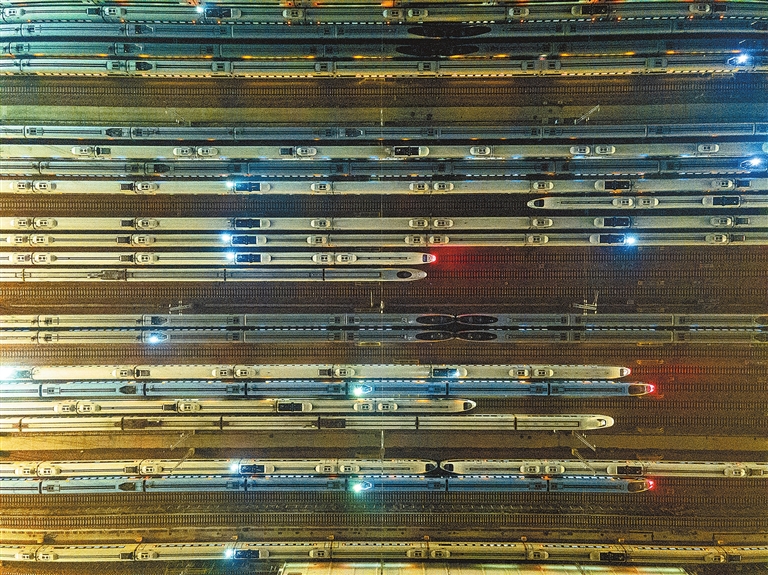 2月1日凌晨,中國鐵路鄭州局集團有限公司鄭州動車段停車場內(nèi),一列列完成當(dāng)日運營任務(wù)的動車組陸續(xù)返回。