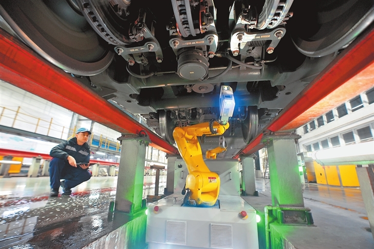 走進動車段檢修庫,只見最新型復(fù)興號和以往常見的和諧號等各類動車組正有序接受檢修。一臺智能機器人在車底靈活穿梭,自動檢查底盤關(guān)鍵部件;一旁的工作人員通過電腦精準(zhǔn)操控機械臂,實現(xiàn)人機協(xié)同作業(yè)。智能化檢修為高鐵安全運維增添科技保障。