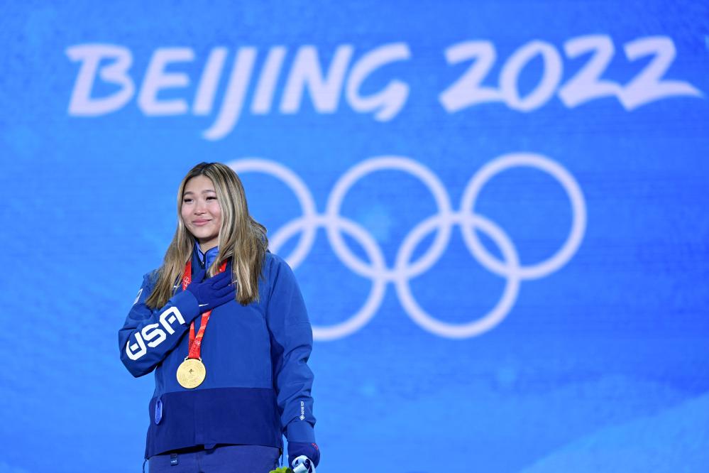 2022年2月10日,冠軍美國(guó)選手克洛伊·金在北京2022年冬奧會(huì)單板滑雪女子U型場(chǎng)地技巧獎(jiǎng)牌頒發(fā)儀式上。新華社記者 戴天放 攝