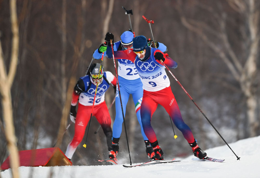 2022年2月18日,挪威選手斯圖拉·霍爾姆·萊格雷德(前)在比賽中。當(dāng)日,北京2022年冬奧會冬季兩項(xiàng)男子15公里集體出發(fā)比賽在國家冬季兩項(xiàng)中心舉行。新華社記者 鄧華 攝