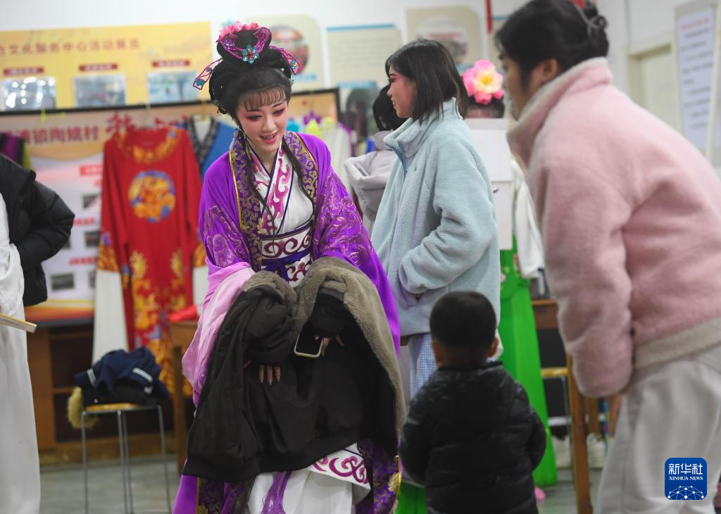 1月27日,在金華市婺城區(qū)莘畈鄉(xiāng)吳村,九州婺劇團的演員在演出前準備。新華社記者 翁忻旸 攝