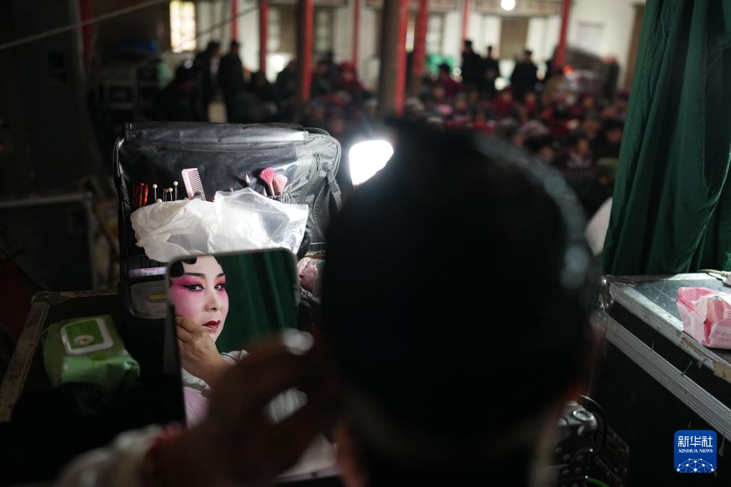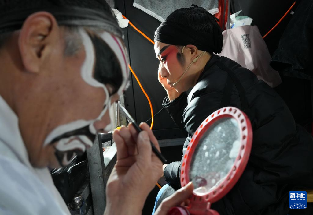1月27日,在金華市婺城區(qū)莘畈鄉(xiāng)吳村,九州婺劇團的演員在演出前化妝。新華社記者 翁忻旸 攝