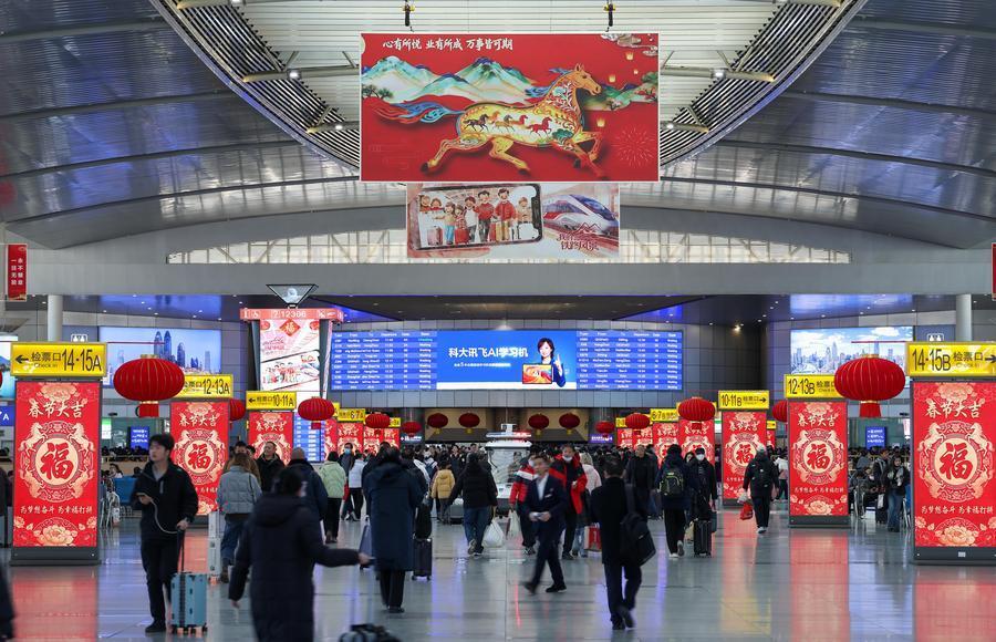 走進天津站候車廳,撲面而來的是一股熱鬧勁兒。大紅燈籠、大型中國結高懸各處,電子屏持續(xù)滾動馬年春節(jié)主題圖片,濃厚的過年氛圍感染著每一位往來旅客。