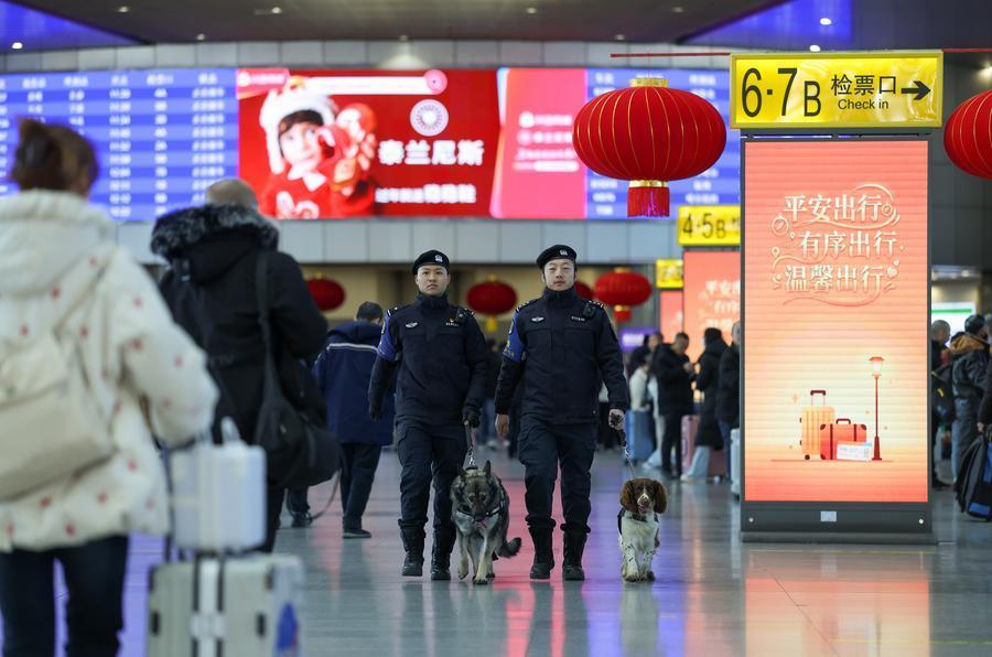 2月2日,天津鐵路公安處特警在天津站候車廳巡邏值守。新華社記者 孫凡越 攝