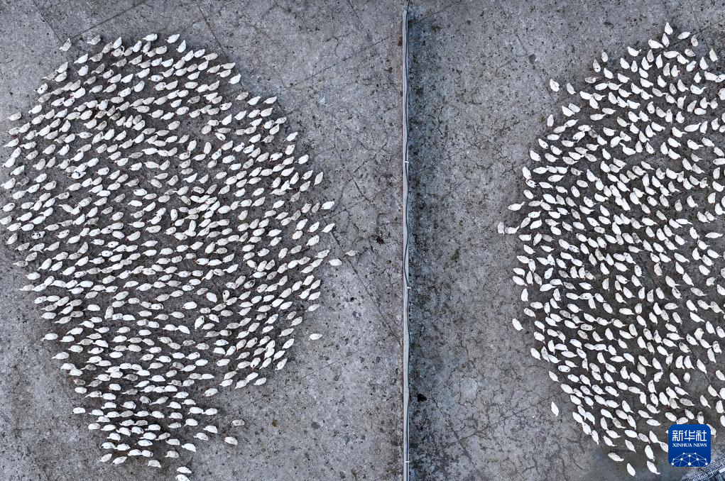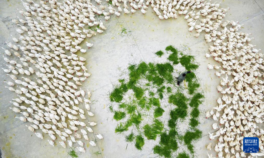 工人在貴州省錦屏縣銅鼓鎮(zhèn)馬臺(tái)生態(tài)種鵝養(yǎng)殖基地投放草料(2020年3月11日攝,無人機(jī)照片)。新華社記者 楊文斌 攝