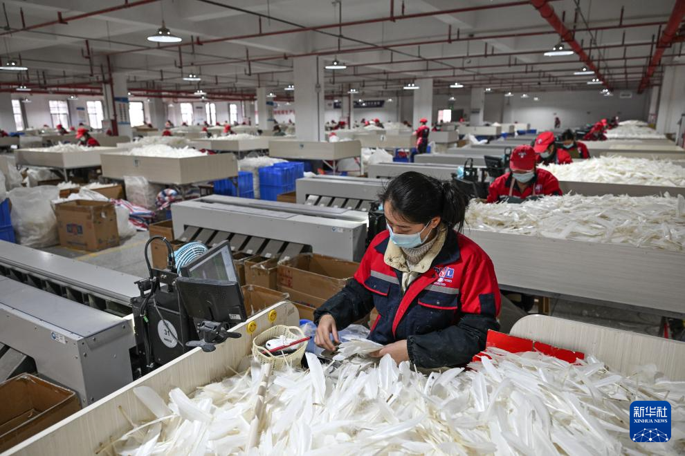 工人在貴州錦屏經(jīng)濟(jì)開發(fā)區(qū)羽毛球生產(chǎn)基地分級生產(chǎn)羽毛球所需的鵝毛(2026年1月22日攝)。新華社記者 楊文斌 攝