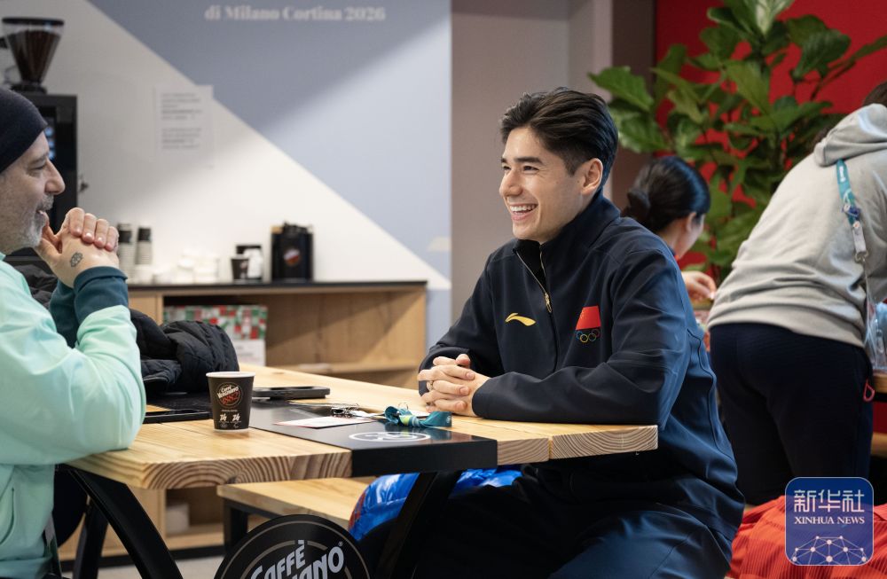 在意大利米蘭奧運(yùn)村,中國(guó)短道速滑隊(duì)運(yùn)動(dòng)員劉少昂(右)與人交談。新華社記者 張豪夫 攝