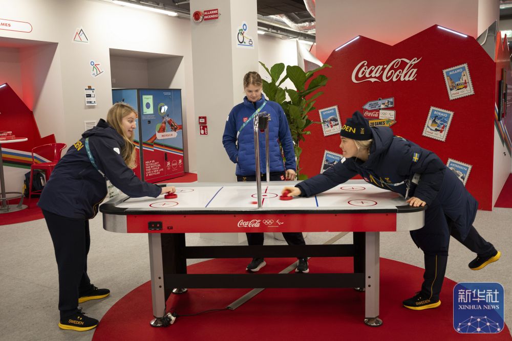 在意大利米蘭奧運(yùn)村,瑞典隊(duì)運(yùn)動(dòng)員玩空氣曲棍球。新華社記者 張豪夫 攝