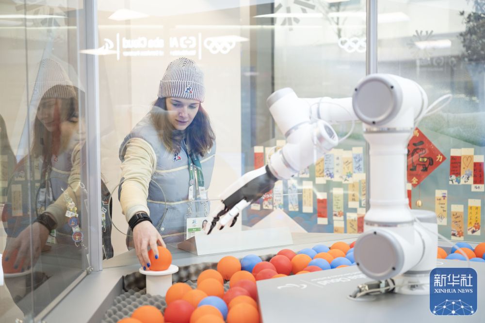 在意大利米蘭奧運(yùn)村,法國(guó)冰球隊(duì)運(yùn)動(dòng)員在贊助商阿里云展臺(tái)體驗(yàn)智能徽章交換。新華社記者 張豪夫 攝