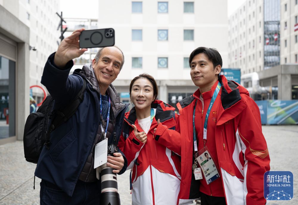 在意大利米蘭奧運(yùn)村,一名記者與中國(guó)花滑隊(duì)運(yùn)動(dòng)員隋文靜(中)、韓聰(右)自拍留念。新華社記者 張豪夫 攝