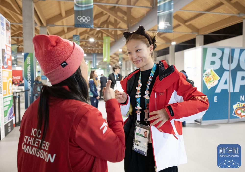 在意大利米蘭奧運(yùn)村,中國(guó)速度滑冰隊(duì)運(yùn)動(dòng)員楊濱瑜(右)與工作人員交換徽章。新華社記者 張豪夫 攝