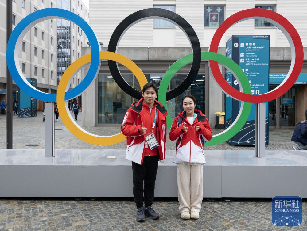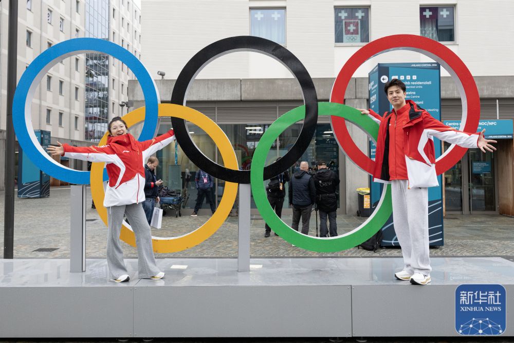 在意大利米蘭奧運(yùn)村,中國(guó)花滑隊(duì)運(yùn)動(dòng)員王詩(shī)玥(左)、柳鑫宇與奧運(yùn)五環(huán)合影。新華社記者 張豪夫 攝