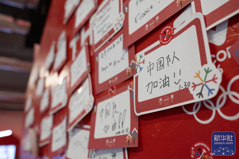 這是2月3日在意大利米蘭奧運(yùn)村拍攝的“中國(guó)隊(duì)加油”祝福貼紙。新華社記者 張豪夫 攝