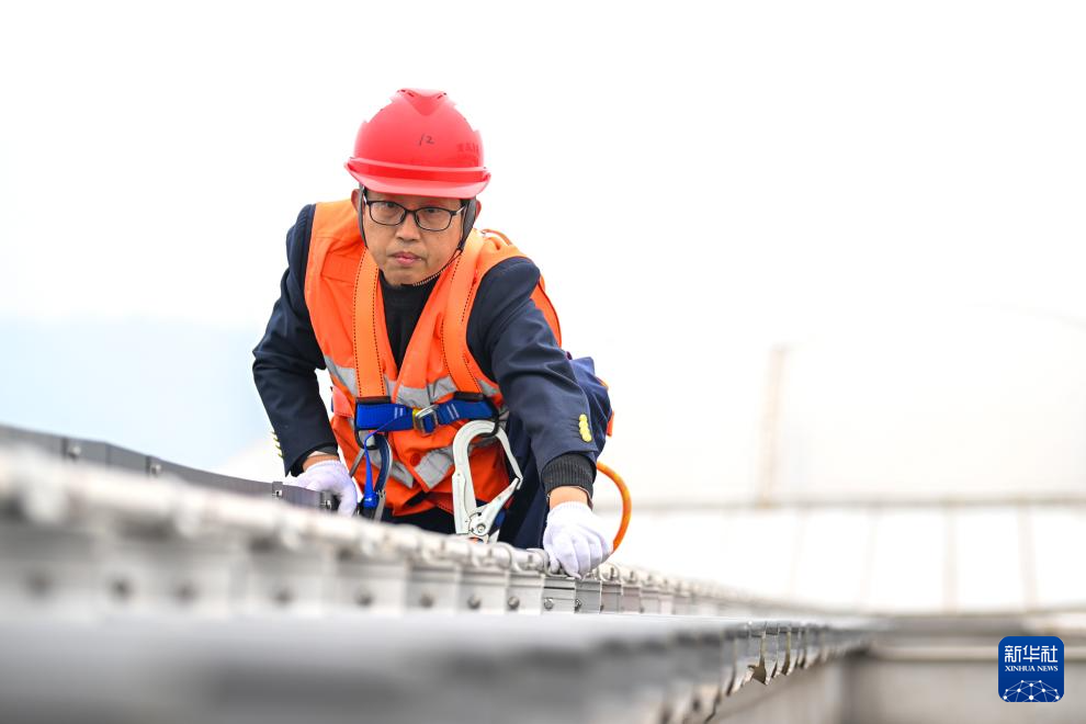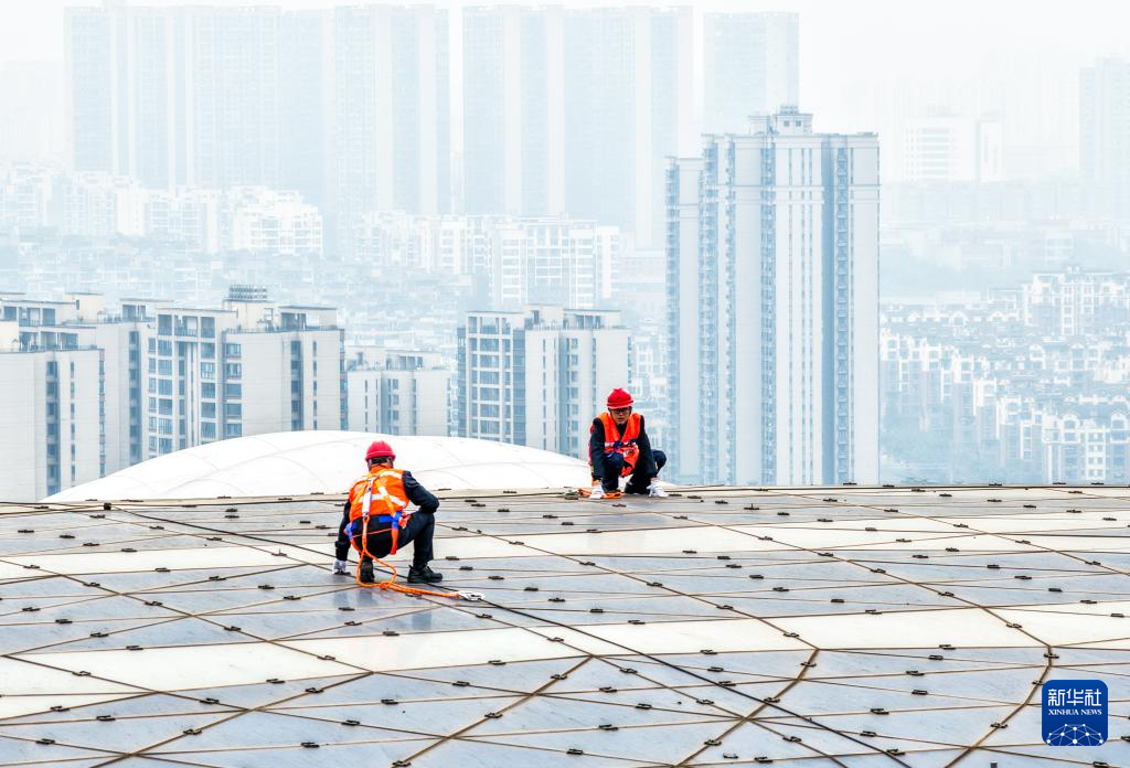 2月3日,魯奇在重慶東站站房屋頂緊固螺栓。新華社記者 唐奕 攝