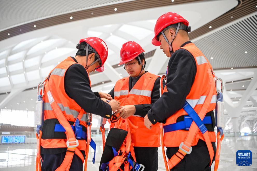 2月3日,進入重慶東站站房屋頂進行巡檢作業(yè)前,蹇洲(中)、魯奇(左)、胡渝平在穿戴安全繩。新華社記者 唐奕 攝