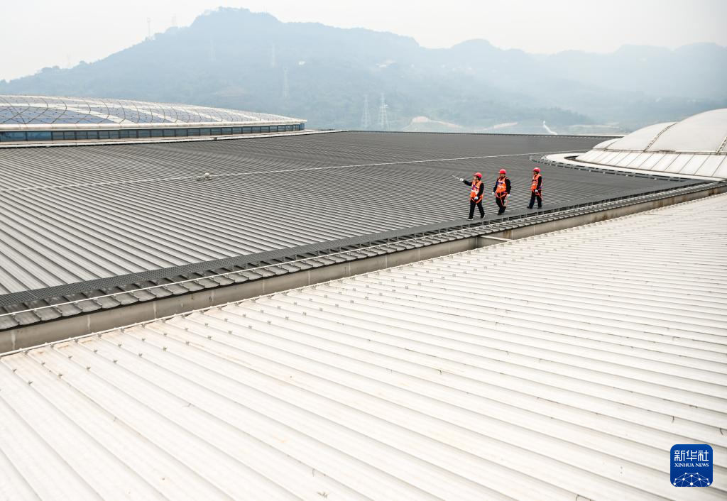 2月3日,蹇洲(左)和胡渝平在重慶東站站房屋頂馬道上進行巡檢作業(yè)。新華社記者 唐奕 攝