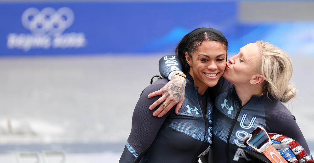 2022年2月19日,美國選手凱莉·漢弗萊斯(右)和隊(duì)友凱莎·洛夫在北京冬奧會(huì)女子雙人雪車比賽后。新華社記者 姚劍鋒 攝