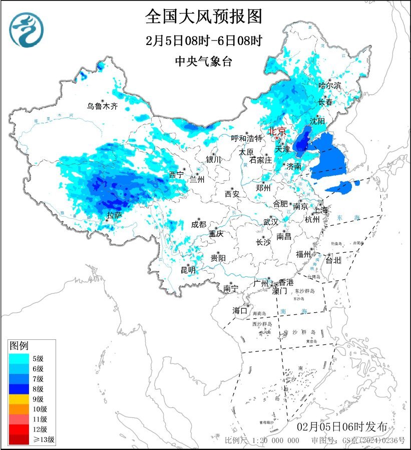 預(yù)計,2月5日08時至6日08時,新疆北疆、青海大部、西藏中北部、內(nèi)蒙古西部和東部、東北地區(qū)西部和南部、華北、山東半島等地部分地區(qū)有5~6級風(fēng),陣風(fēng)7~8級,西藏中北部局地陣風(fēng)風(fēng)力可達9級及以上;渤海、渤海海峽、黃海大部海域?qū)⒂?~8級、陣風(fēng)9級的大風(fēng)。
