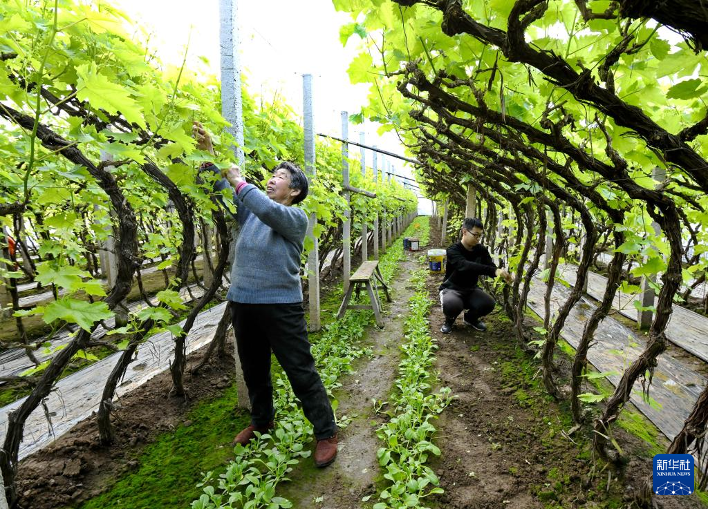 2月4日,河北省唐山海港經(jīng)濟開發(fā)區(qū)王灘鎮(zhèn)的農(nóng)民在管護大棚葡萄。新華社記者 楊世堯 攝