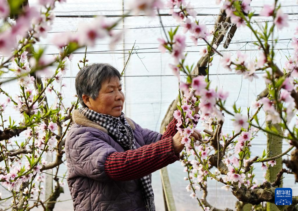 2月4日,河北省唐山海港經(jīng)濟開發(fā)區(qū)王灘鎮(zhèn)的一位農(nóng)民在大棚內(nèi)給桃樹疏花。新華社記者 楊世堯 攝