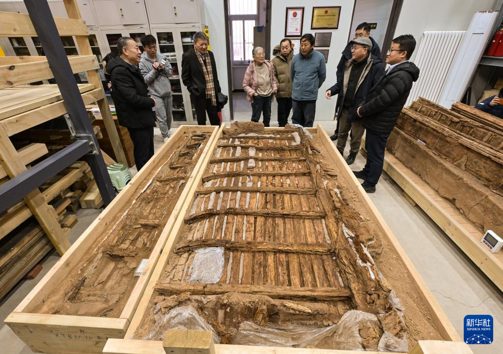 專家們在實驗室考古方艙內(nèi)察看墓葬M20出土的完整木榻(2月1日攝)。新華社記者 李賀 攝