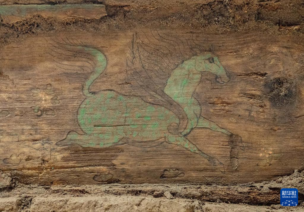 這是在實驗室考古方艙內(nèi)拍攝的墓葬M20出土的木棺座壸門內(nèi)的彩繪“翼馬”圖案(2月1日攝)。新華社記者 李賀 攝