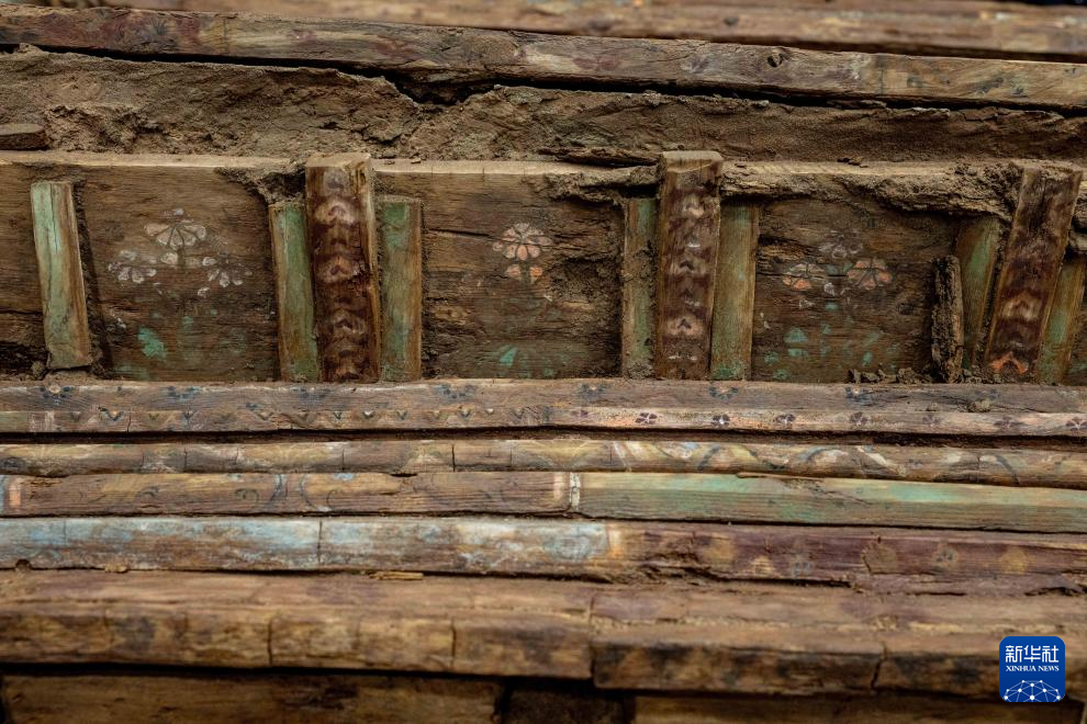 這是在實驗室考古方艙內(nèi)拍攝的墓葬M20出土木棺座疊澀上的彩繪圖案(2月1日攝)。新華社記者 李賀 攝