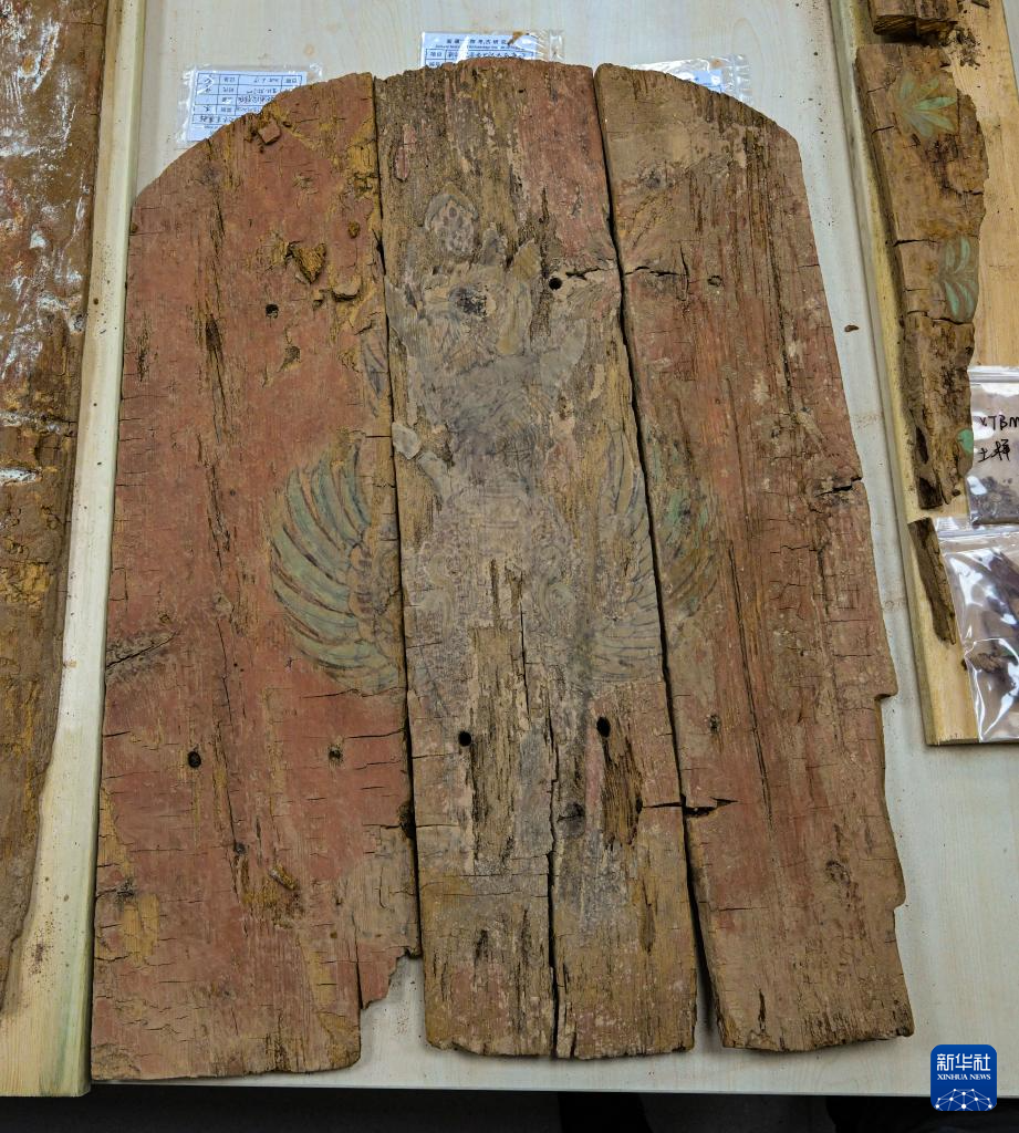 這是在實驗室考古方艙內(nèi)拍攝的彩繪著朱雀圖案的木棺前檔(2月1日攝)。新華社記者 李賀 攝