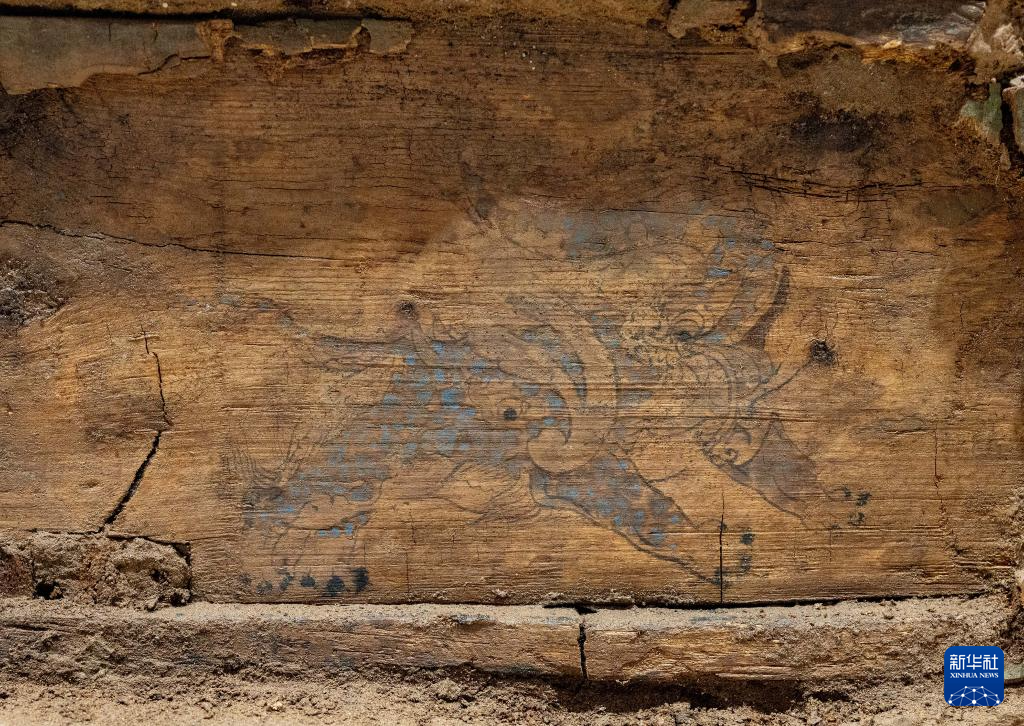這是在實驗室考古方艙內(nèi)拍攝的墓葬M20出土的木棺座壸門內(nèi)的彩繪“瑞獸”圖案(2月1日攝)。新華社記者 李賀 攝