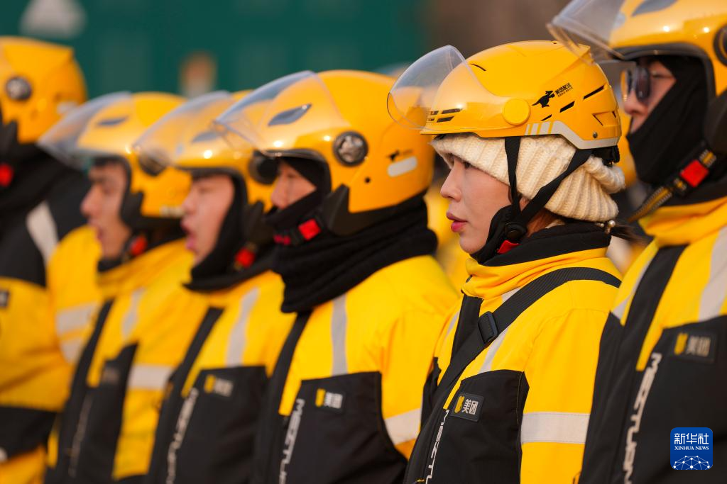 戚德敏(右二)在位于山西省太原市小店區(qū)的美團配送合作商服務中心參加早會(1月29日攝)。新華社記者 楊晨光 攝