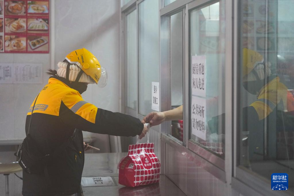 戚德敏在位于山西省太原市小店區(qū)的一家商戶內取餐(1月29日攝)。新華社記者 楊晨光 攝