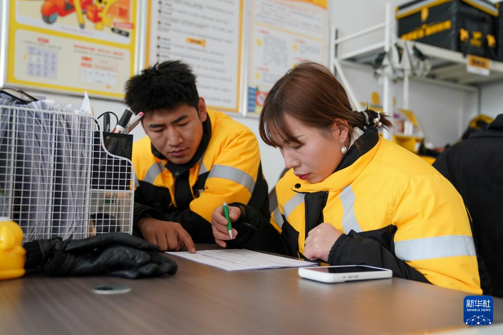在位于山西省太原市小店區(qū)的美團配送合作商服務中心,戚德敏(右)確認上個月的出勤情況(2月4日攝)。新華社記者 楊晨光 攝