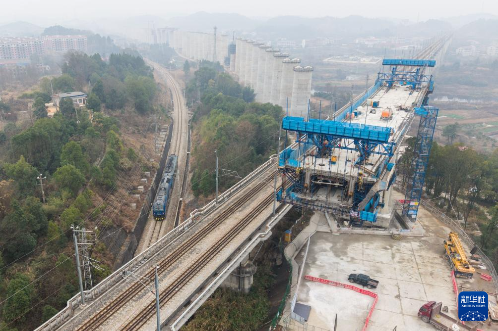 2月5日,在邵永高鐵肖吉普特大橋建設(shè)工地,中鐵四局工人在進(jìn)行箱梁架設(shè)作業(yè)(無(wú)人機(jī)照片)。新華社記者 陳思汗 攝
