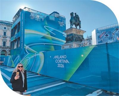 在米蘭市中心的大教堂廣場上,當?shù)厥忻裨趭W運宣傳展板前自拍。人民日報記者 謝亞宏 攝
