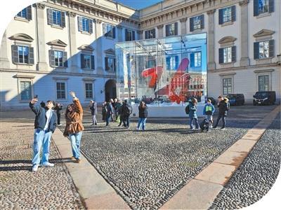 米蘭市民與游客在冬奧會倒計時裝置前拍照合影。 人民日報記者 謝亞宏 攝