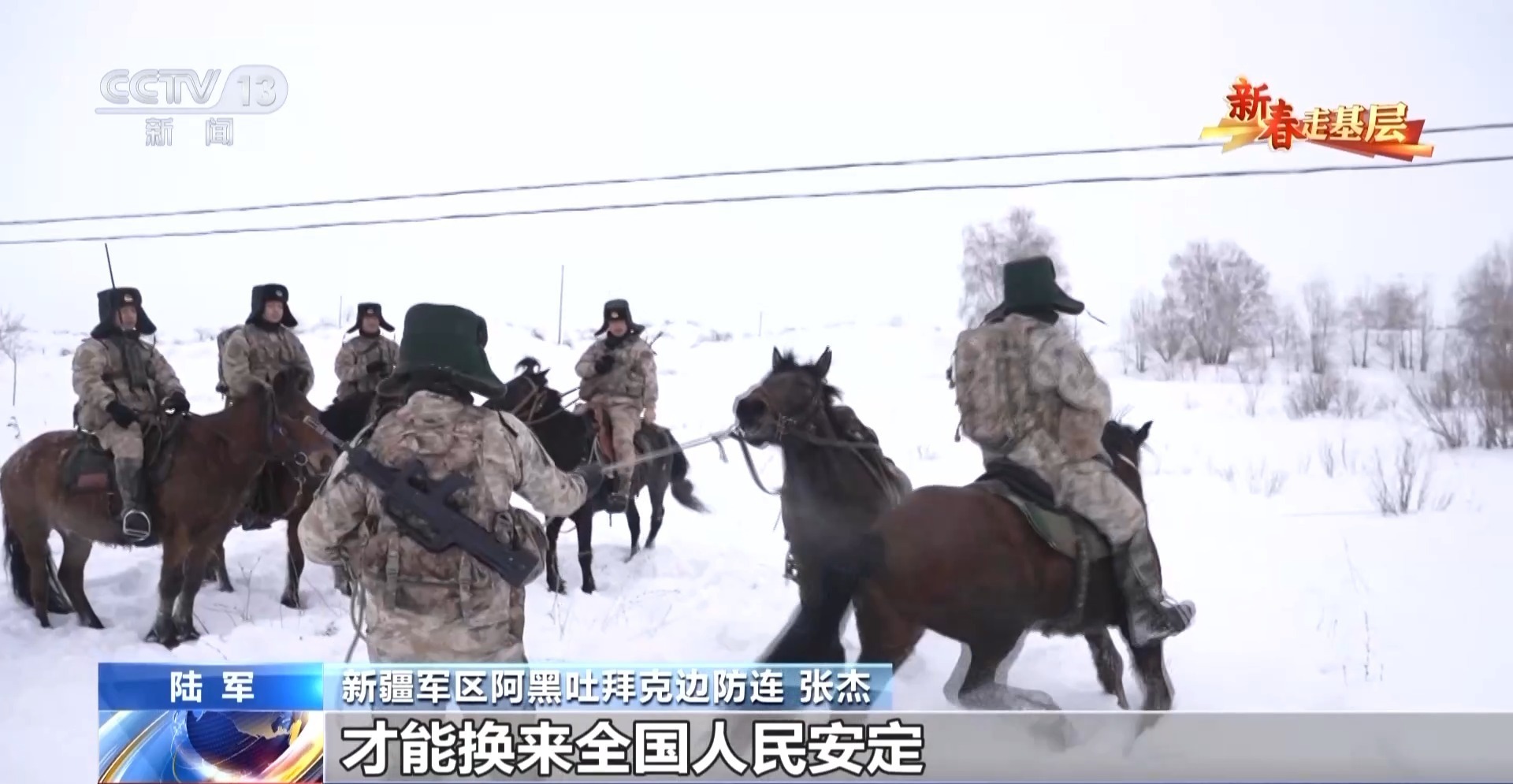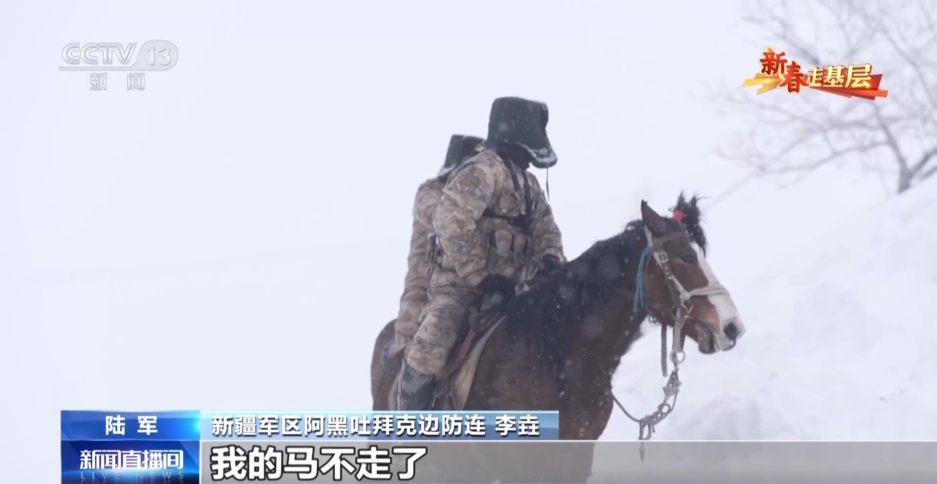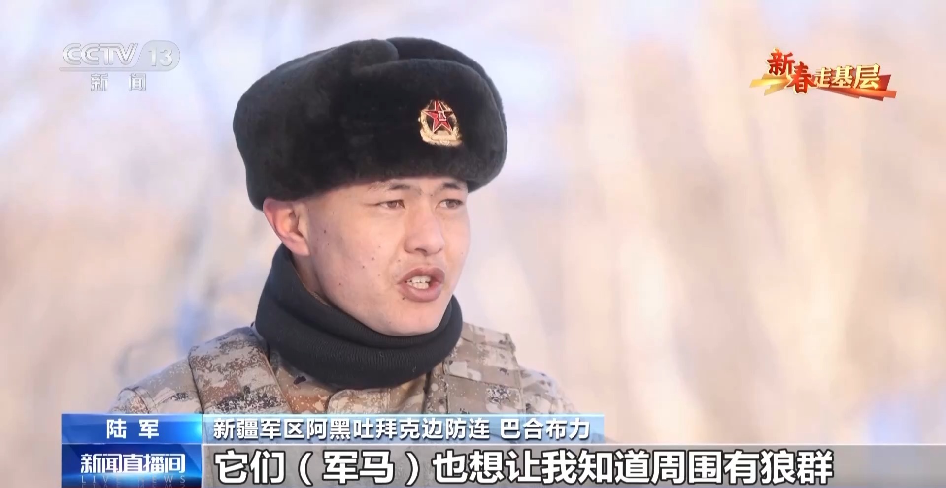 新疆軍區(qū)阿黑吐拜克邊防連 巴合布力:春節(jié)戰(zhàn)備,我和我的馬都不能松懈,軍馬也是全天背著鞍子,隨時(shí)待命。在外人眼里,在邊防連就是騎馬、天天趕馬,但是我們自己覺得,我也在時(shí)時(shí)刻刻準(zhǔn)備為國(guó)家犧牲,非常值得。