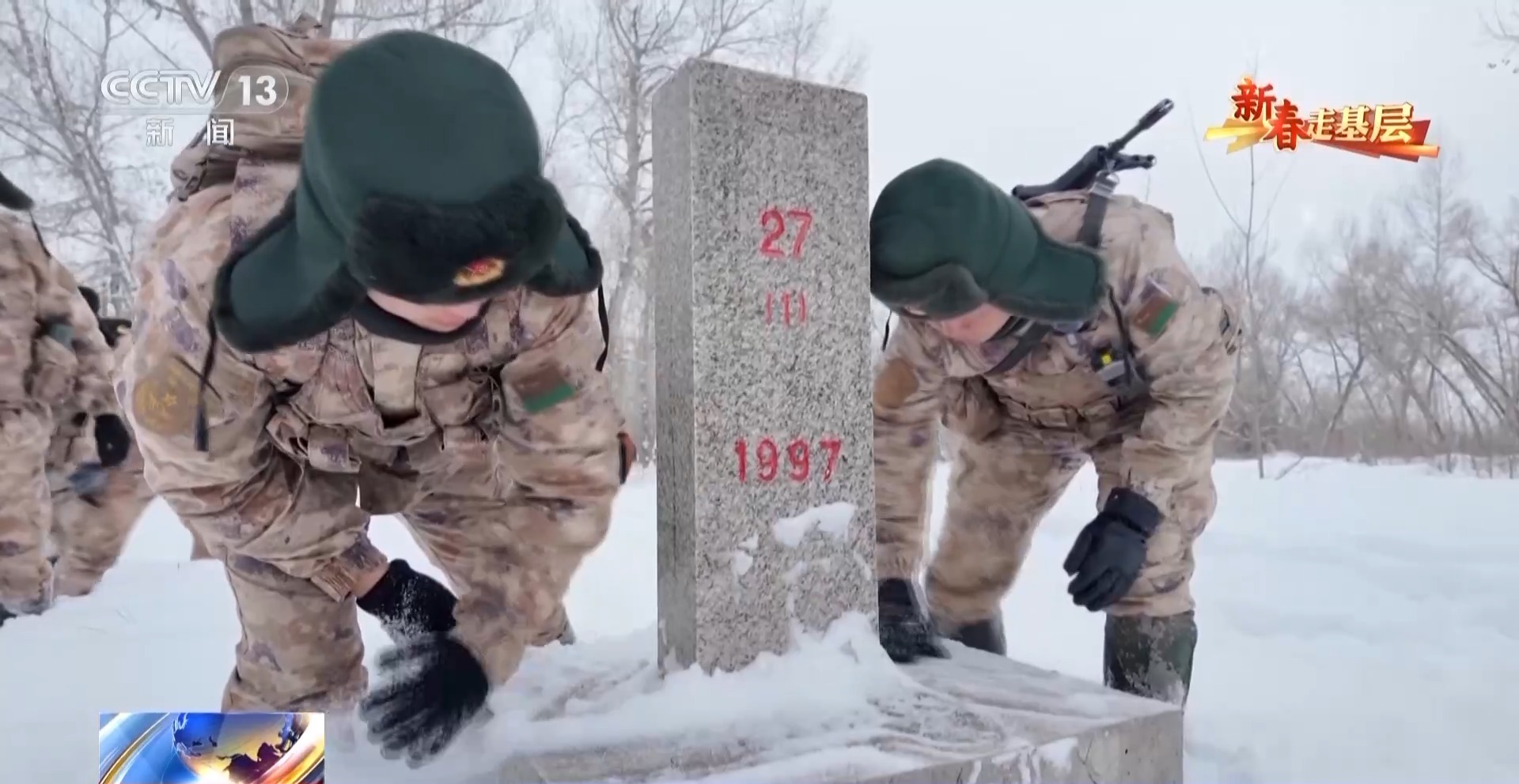 歷經(jīng)八個(gè)小時(shí)的風(fēng)雪跋涉,穿過沙山、沼澤、白樺林,27號(hào)界標(biāo)終于出現(xiàn)在視野中。官兵們下馬,拂去界標(biāo)上的積雪。新兵李垚臉上最初的緊張已褪去,透出戰(zhàn)士的堅(jiān)毅。