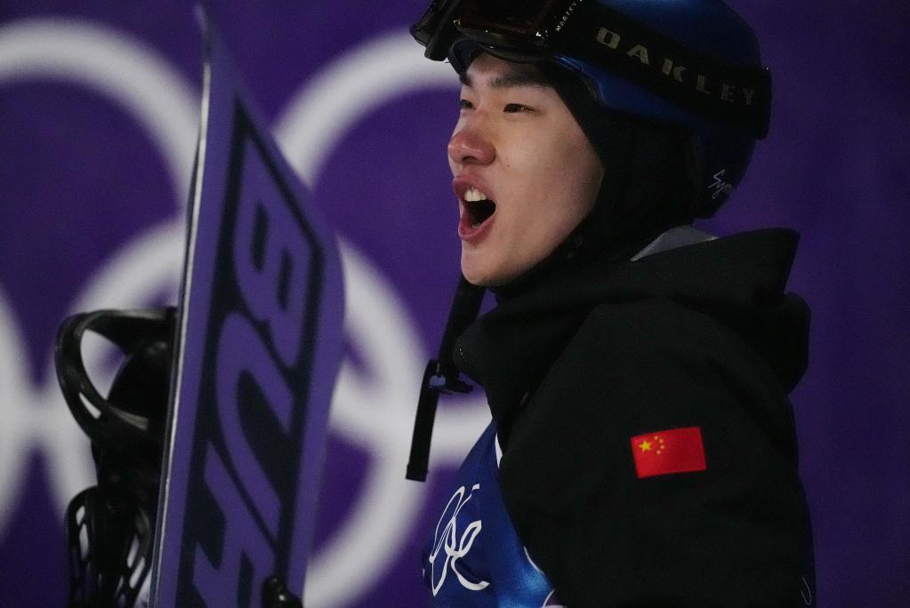 2月5日,蘇翊鳴在第三跳后慶祝。新華社記者 鄔惠我 攝