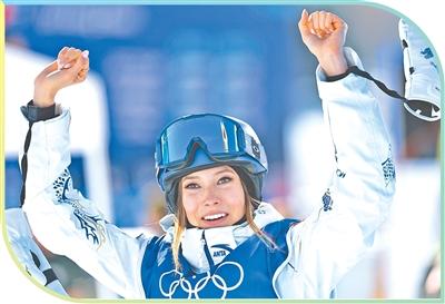 自由式滑雪女子坡面障礙技巧資格賽中,中國隊選手谷愛凌在試跳后慶祝。新華社記者王鵬攝