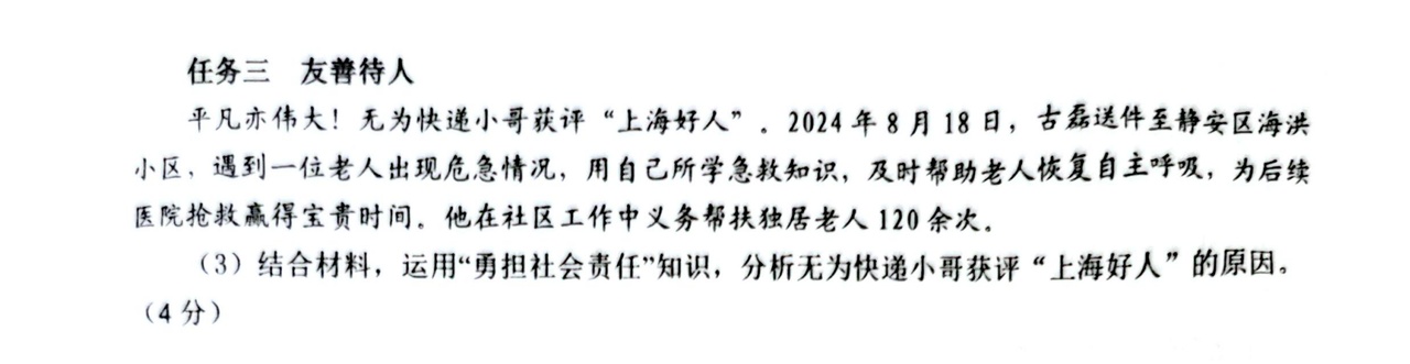 今年1月底,在蕪湖無為市劉渡中學(xué)八年級(jí)“道德與法治”期末考試中,古磊的女兒樂樂意外發(fā)現(xiàn)試卷題目上印著自己爸爸的名字——“平凡亦偉大!無為快遞小哥獲評(píng)‘上海好人’。古磊送件至靜安區(qū)海洪小區(qū)時(shí),遇到一位老人出現(xiàn)危急情況,用自己所學(xué)急救知識(shí),及時(shí)幫助老人恢復(fù)自主呼吸,為后續(xù)醫(yī)院搶救贏得寶貴時(shí)間。他在社區(qū)工作中義務(wù)幫扶獨(dú)居老人120余次。結(jié)合材料,運(yùn)用‘勇?lián)鐣?huì)責(zé)任’知識(shí),分析無為快遞小哥獲評(píng)‘上海好人’的原因”。