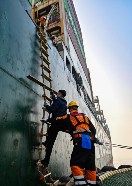 天津港引航中心引航員孫勃(左)從拖輪上攀爬軟梯登船。新華社記者趙子碩 攝