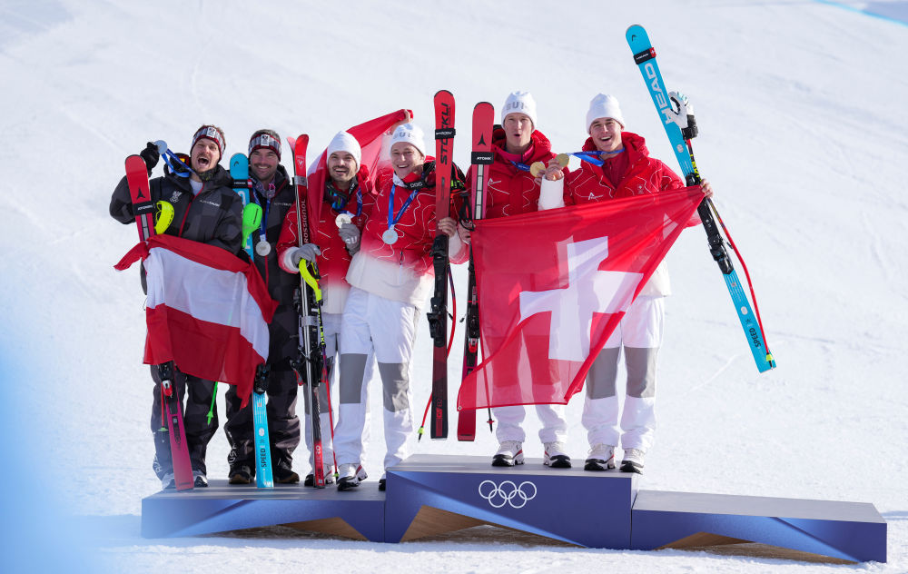 2月9日,瑞士隊(duì)選手馮阿爾曼(右)與隊(duì)友內(nèi)夫在領(lǐng)獎(jiǎng)臺(tái)上。新華社記者 胡虎虎 攝