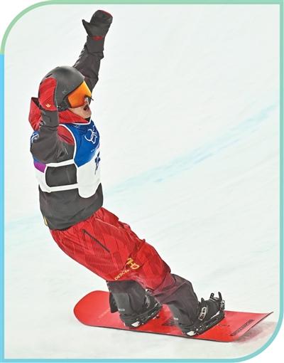 中國(guó)隊(duì)選手王梓陽(yáng)在單板滑雪男子U型場(chǎng)地技巧資格賽中慶祝。新華社記者 張宏祥攝