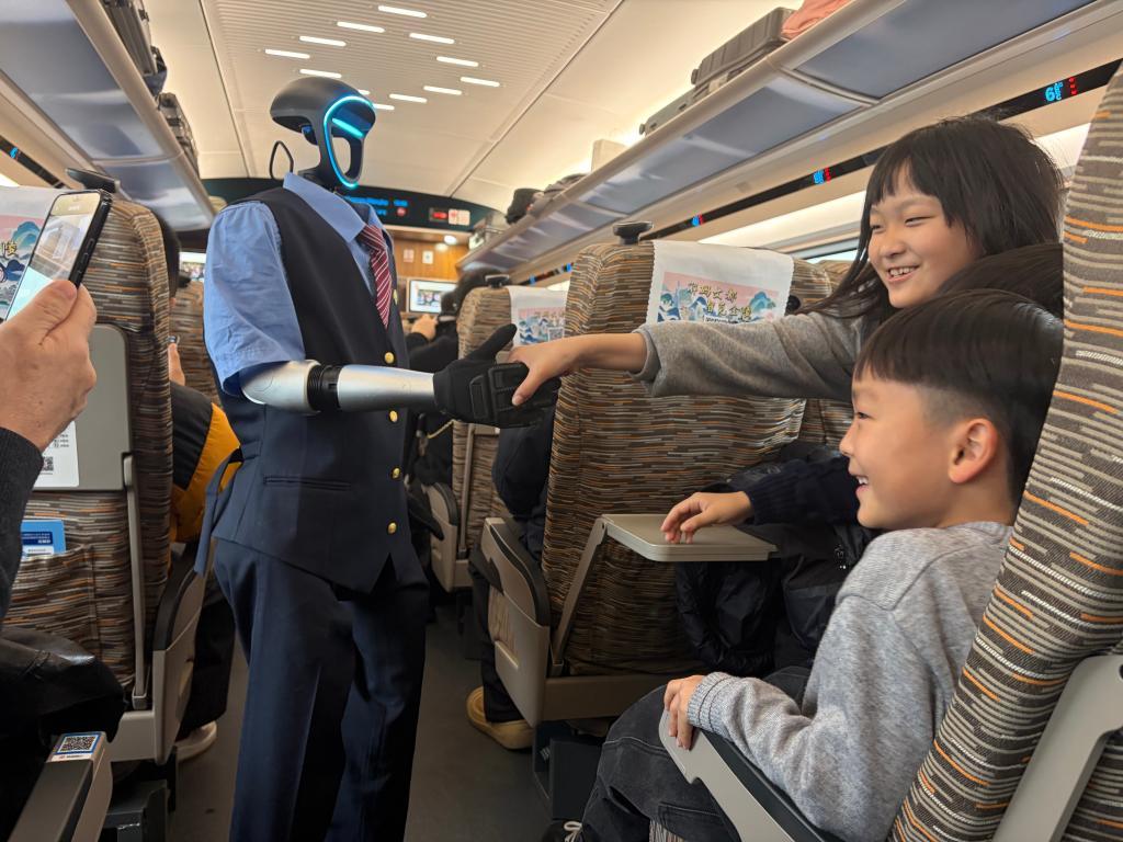 旅客陳女士帶著兩個孩子乘車,對這一創(chuàng)新服務(wù)直言驚喜:“盡管現(xiàn)階段機(jī)器人乘務(wù)員的功能還在不斷完善,但人形機(jī)器人出現(xiàn)在春運(yùn)中,本身就是具有標(biāo)志性的事件,這是科技深度融入日常生活的縮影,也是智慧春運(yùn)、溫馨春運(yùn)的鮮活注腳?!?/p>