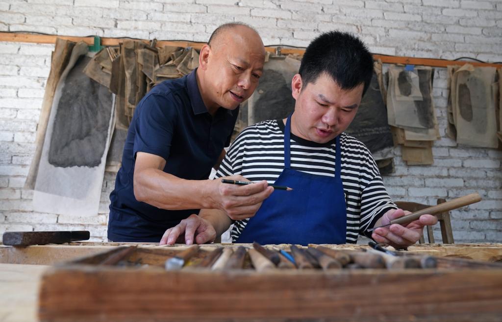 俞友鴻(左)在教授徐家田雕刻技藝(2024年9月20日攝)。新華社記者萬(wàn)象 攝