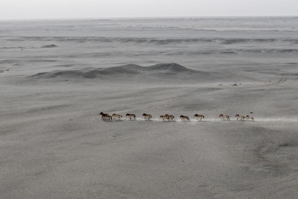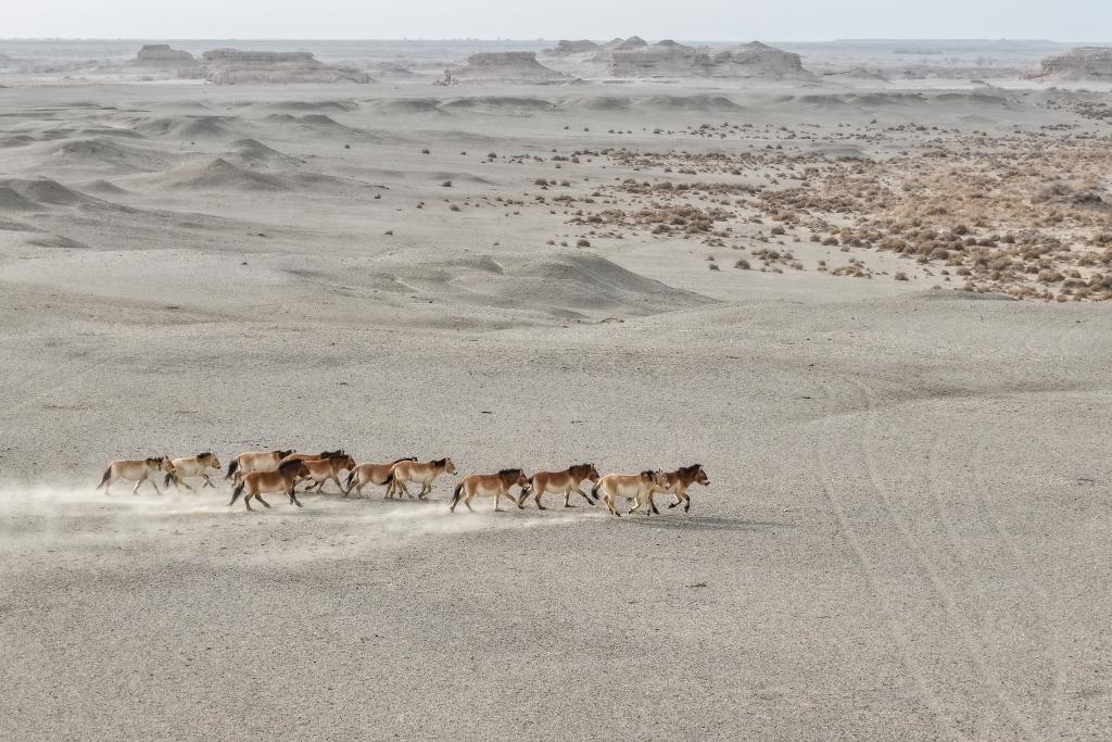一群普氏野馬在甘肅敦煌西湖國(guó)家級(jí)自然保護(hù)區(qū)的戈壁荒漠上奔跑(無(wú)人機(jī)照片)。新華社記者郎兵兵 攝